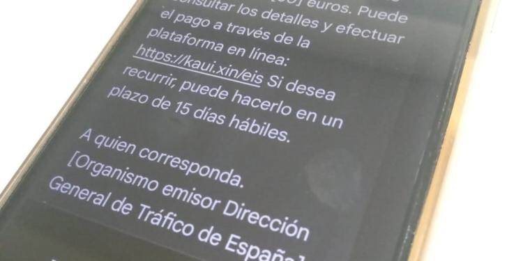 A continuación, el remitente del SMS indica que ha de pagar una multa de 50 euros y que puede efectuar el pago en la plataforma en línea: https://kaui.xin/eis. Se pide mucha prudencia con este tipo de mensajes y siempre consultar con las instituciones pertinentes para poder comprobar e informar sobre este tipo de fraudes.