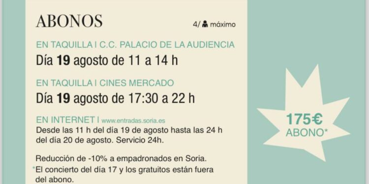 El precio de los abonos del Festival Otoño Musical Soriano es de 175 euros y se pueden adquirir presencial en horario de mañana en la taquilla del Teatro Palacio de la Audiencia (11.00-14.00), en las de Cines Mercado (17.30-22.00) y en la página web desde las 11.00 hasta las 00.00 del 20 de agosto. Las entradas individuales se podrán adquirir desde el día 23.