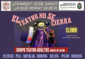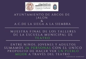 La Asociación Cultural ‘De la Siega a la Siembra’ y el Ayuntamiento de Arcos de Jalón organizan los próximos días 6, 12 y 16 de Mayo a las 18 horas, funciones de teatro representadas por «los más jóvenes de Arcos de Jalón» con el propósito de hacer ver un pueblo mejor a través del teatro.