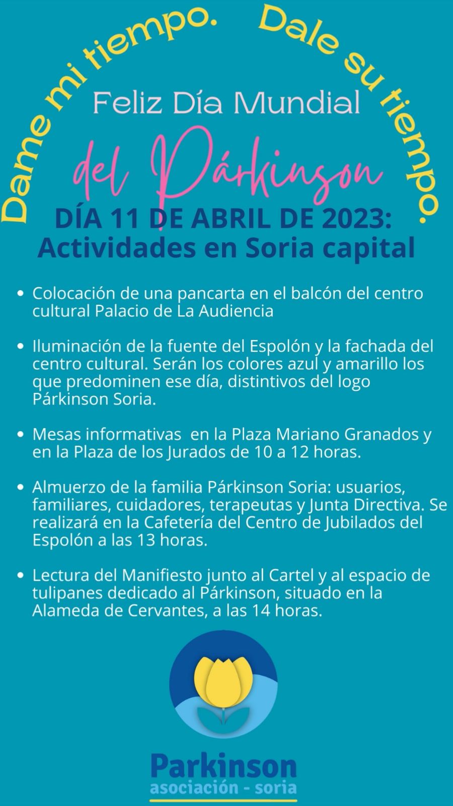 La Asociación Párkinson Soria ha dispuesto un amplio programa para poder celebrar el Día Mundial del Parkinson el próximo 11 de abril. Además de colocación de una pancarta, iluminación de monumentos o mesas informativas, también se dispondrá un almuerzo de la familia Párkinson Soria y la lectura de un manifiesto. Toda la información la puedes consultar en el cartel adjunto.