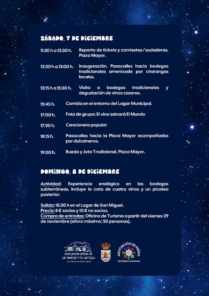 La fecha elegida es el sábado 7 de diciembre. Este año, los protagonistas para la foto de grupo no serán los porrones sino las jarras artesanas elaboradas por Alfamar de Tajueco, tan presente en la artesanía soriana. El 8 de diciembre tendrá lugar una experiencia enológica a cargo de los Amigos de las Bodegas.
