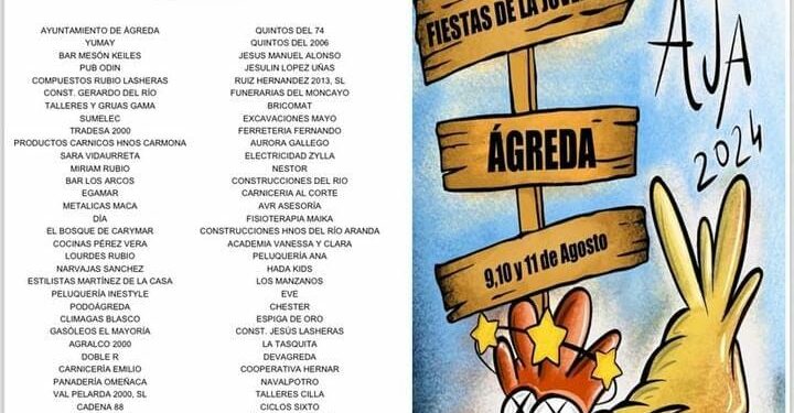 La Asociación de la Juventud de Ágreda (AJA) ha publicado hace un instante el programa de sus fiestas que se celebran este fin de semana. Arrancarán el viernes 9 de agosto a las 18:00 horas con el recorrido del gallo Roque acompañado por la charanga CEDA EL VASO y los cabezudos. Por delante días de mucha diversión que rematarán el domingo 11 de agosto. Toda la programación la podéis consultar aquí: