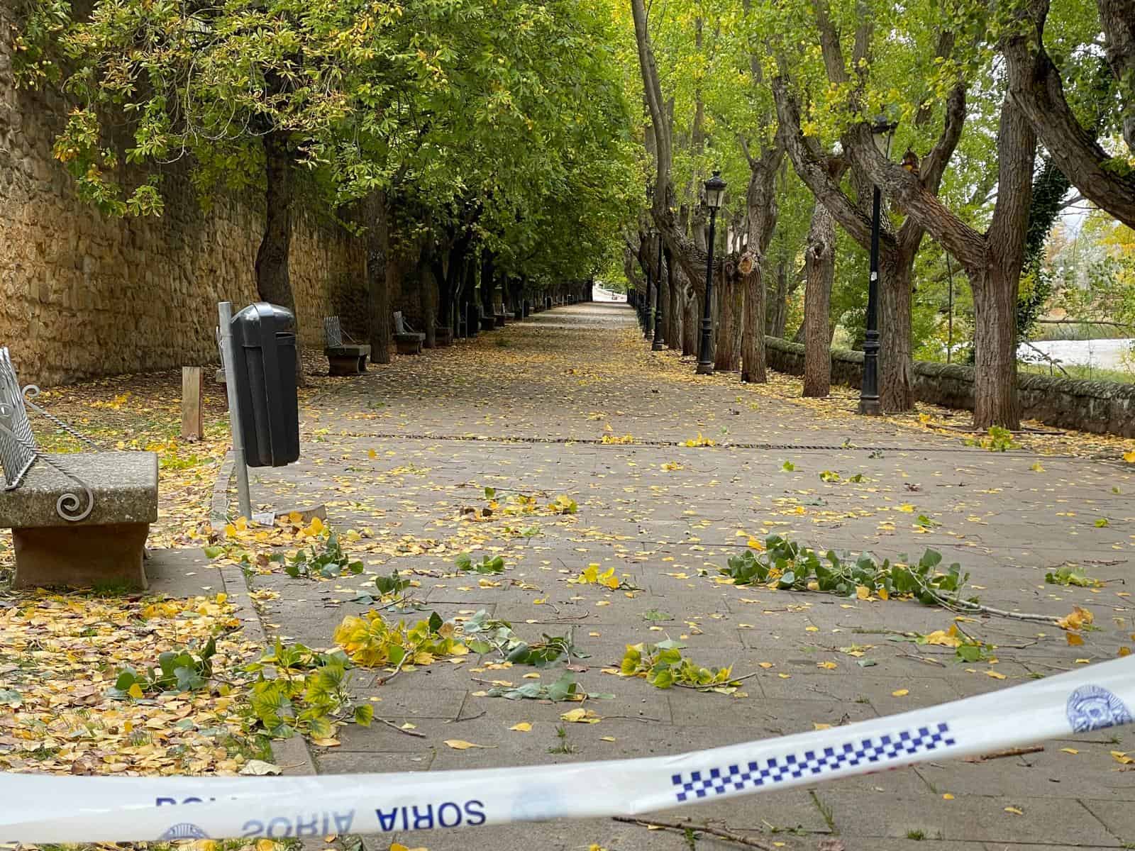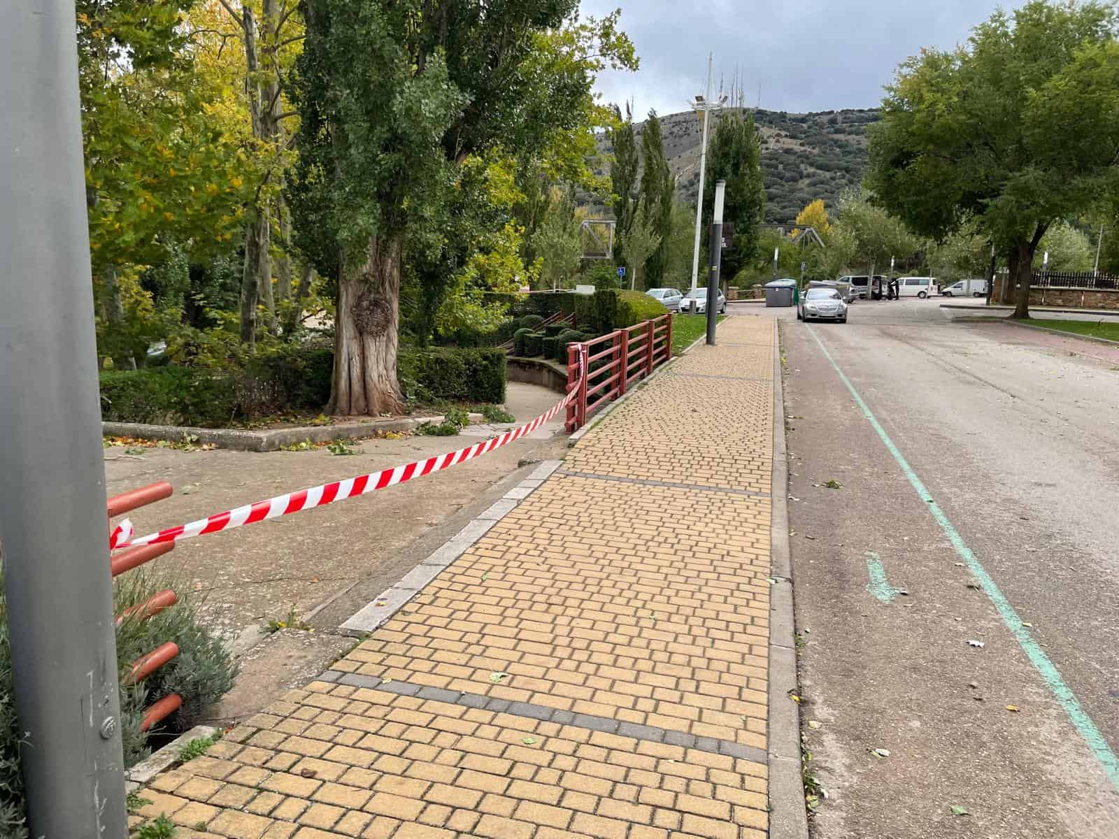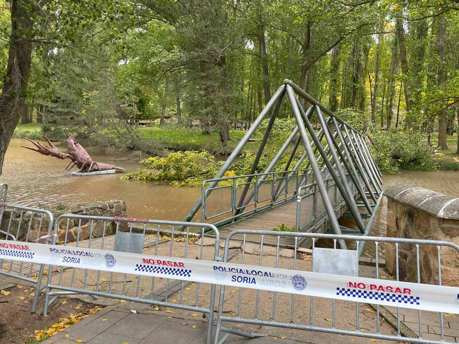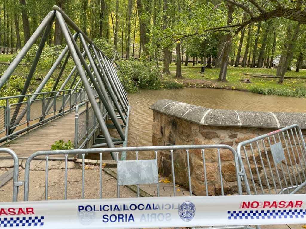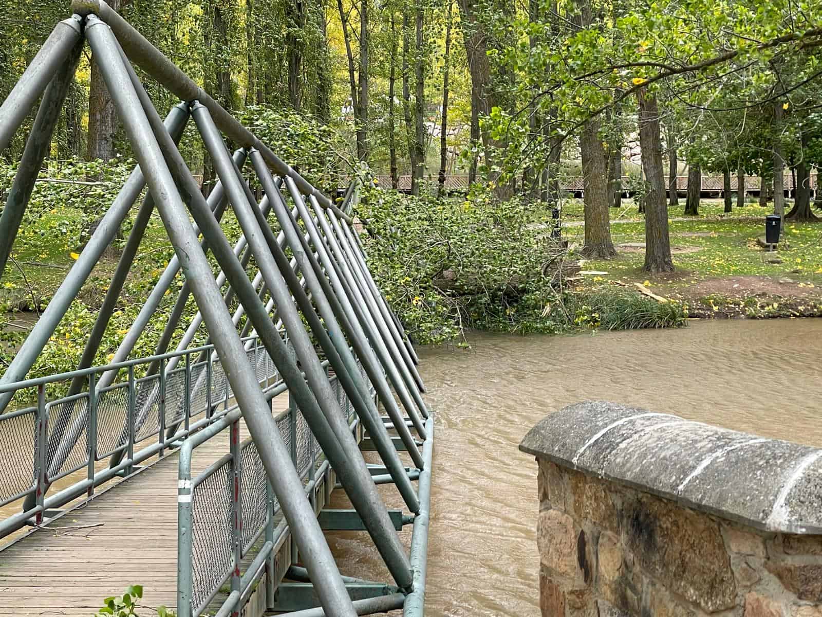 Según indica la AEMet, en la ciudad de Soria se ha alcanzado una racha de 62 km/h. Estas son las imágenes de la caída del árbol sobre la pasarela.