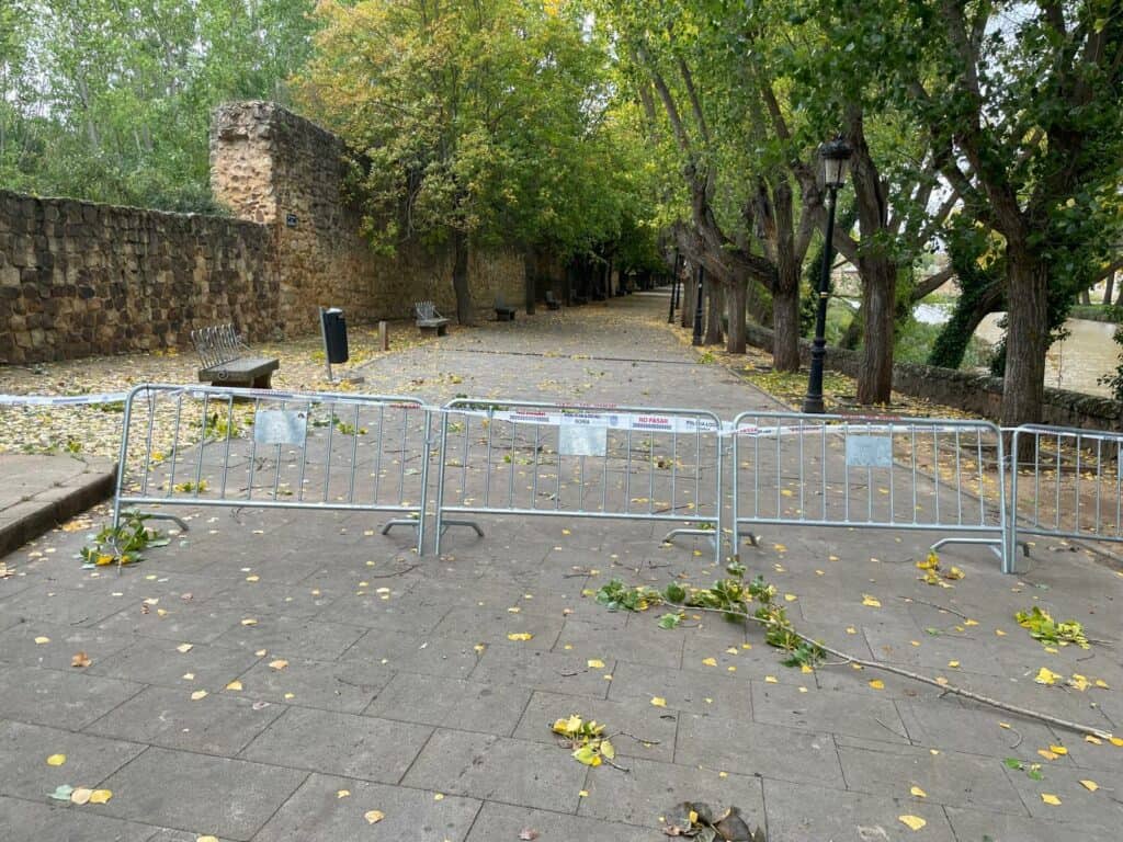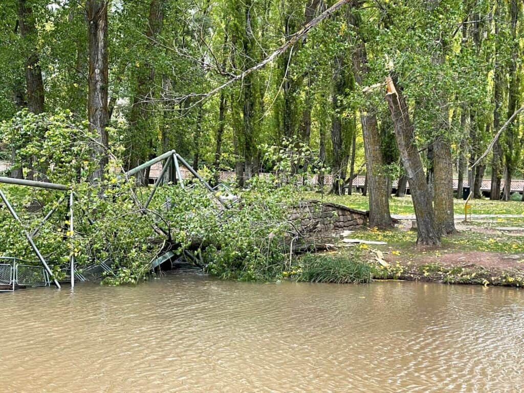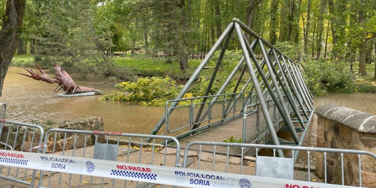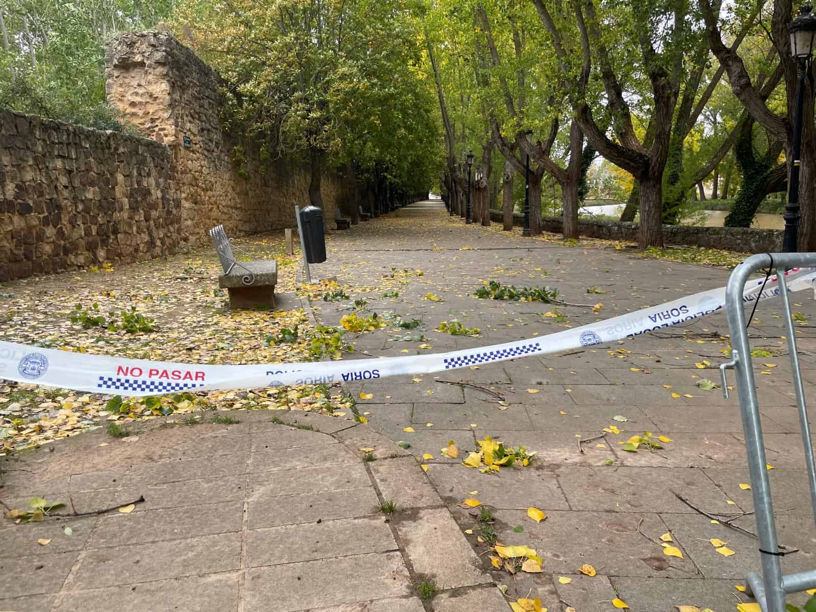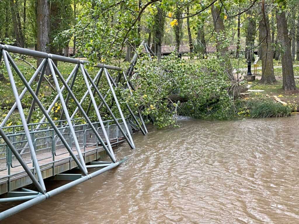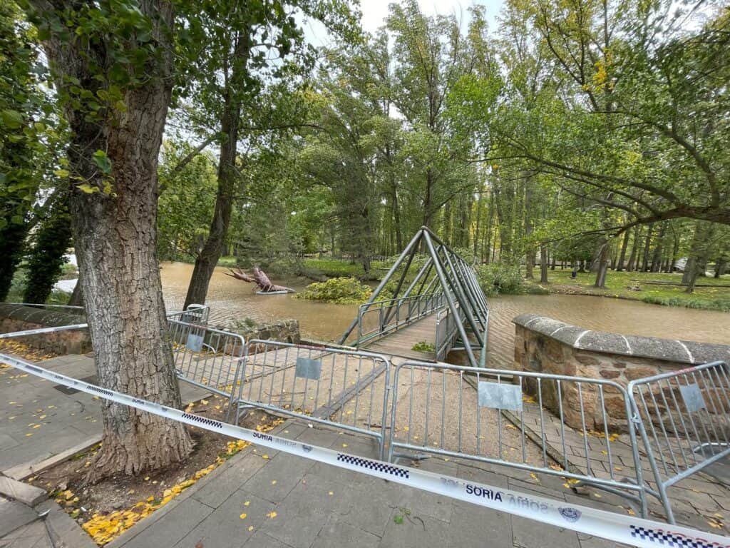 Según indica la AEMet, en la ciudad de Soria se ha alcanzado una racha de 62 km/h. Estas son las imágenes de la caída del árbol sobre la pasarela.