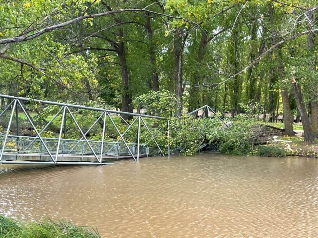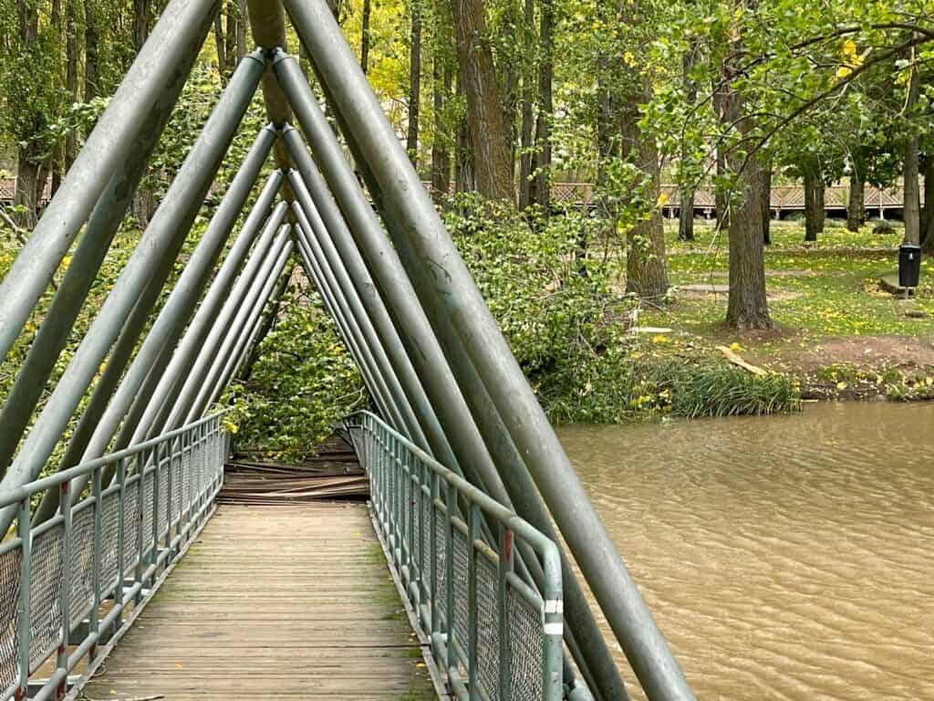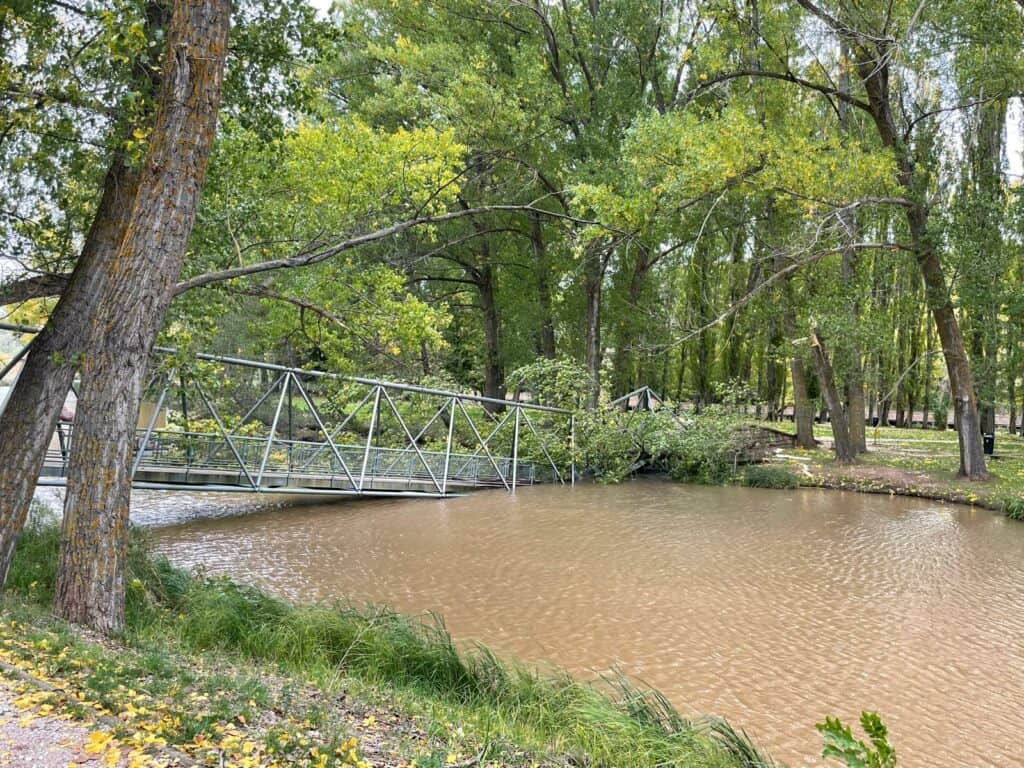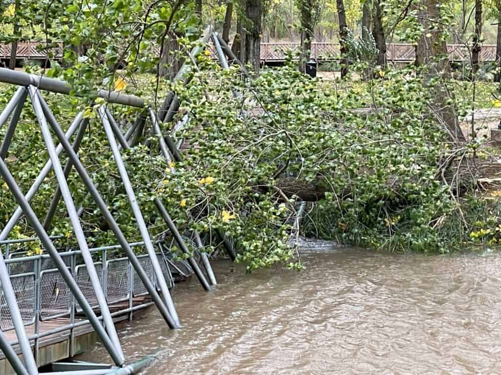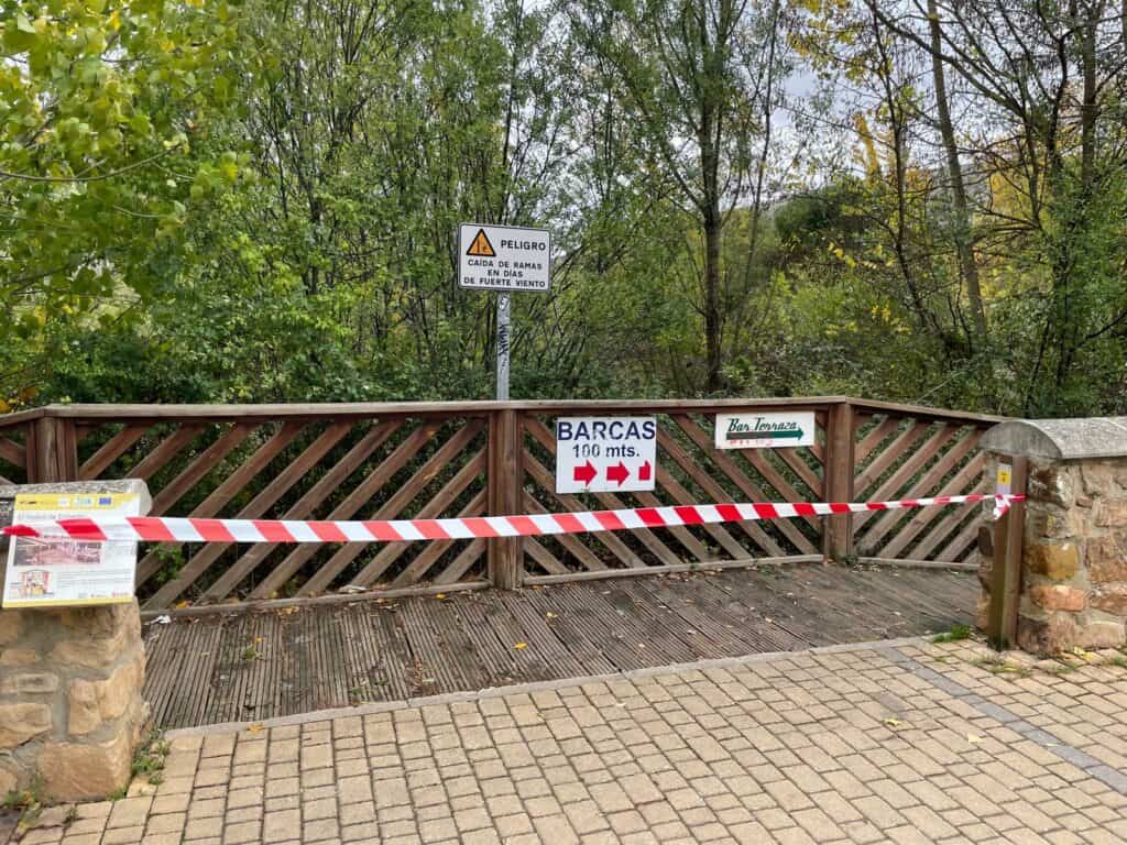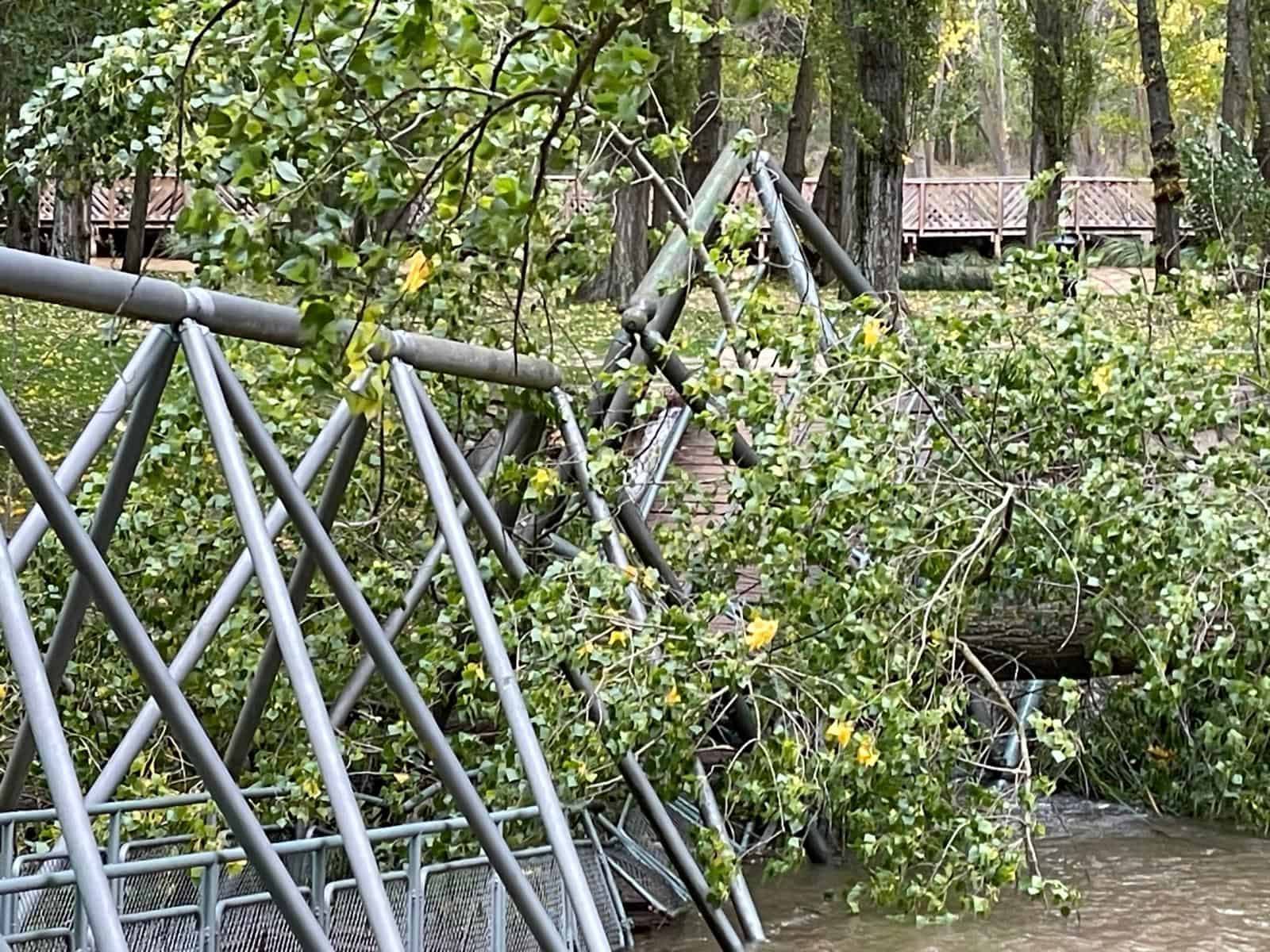 Según indica la AEMet, en la ciudad de Soria se ha alcanzado una racha de 62 km/h. Estas son las imágenes de la caída del árbol sobre la pasarela.