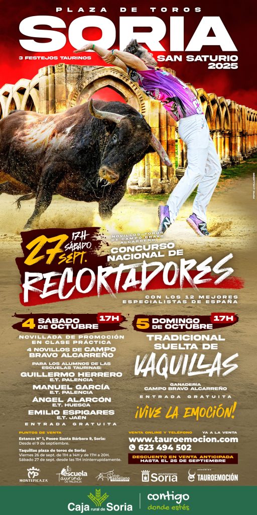 .Sergio Moreno ha indicado que se ha previsto recuperar el 27 de septiembre un concurso nacional de recortadores, que es uno de los platos fuertes de las ferias de San Saturio, combinando recortadores locales como Adrián Rodrigo, Víctor Vela y Pablo Blanco y otros procedentes de distintos puntos como Javier Manso, actual campeón de Valladolid, y Juan Carlos García, actual campeón de Zamora. También se podrá ver a Diego Almarza, uno de los mejores saltadores del momento, que ha triunfado en plazas de toros como Madrid. Se enfrentarán a cuatro novillos de la ganadería Campo Bravo Alcarreño. Serán tres novillos en formato ronda clasificatoria y un novillo para la gran final, donde pasarán los cuatro mejores de todo el concurso.