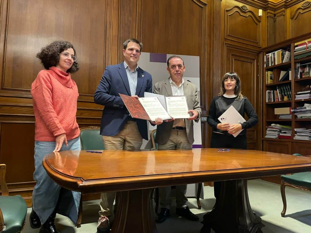 El presidente de la Diputación provincial de Soria, Benito Serrano, firma el convenio de colaboración acompañado de la diputada de Servicios Sociales, Laura Prieto, para la adherencia terapéutica con el presidente del Colegio Oficial de Farmacéuticos, Javier Alonso.