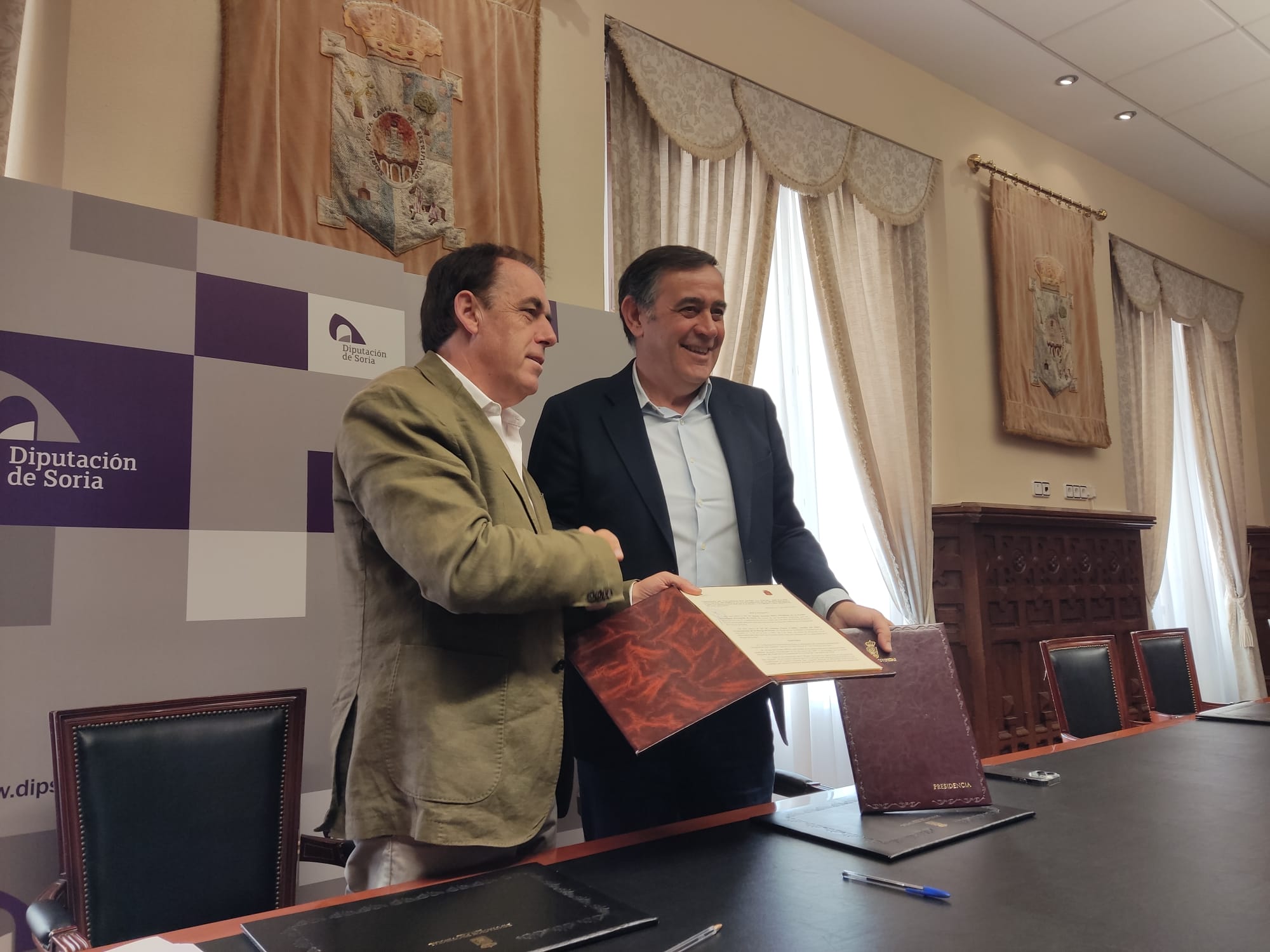 El presidente de la Diputación provincial, Benito Serrano, y el alcalde de El Burgo de Osma, Antonio Pardo, han firmado esta mañana el convenio de colaboración para financiar la restauración de la fachada y parte de la cubierta del centro cultural de San Agustín.