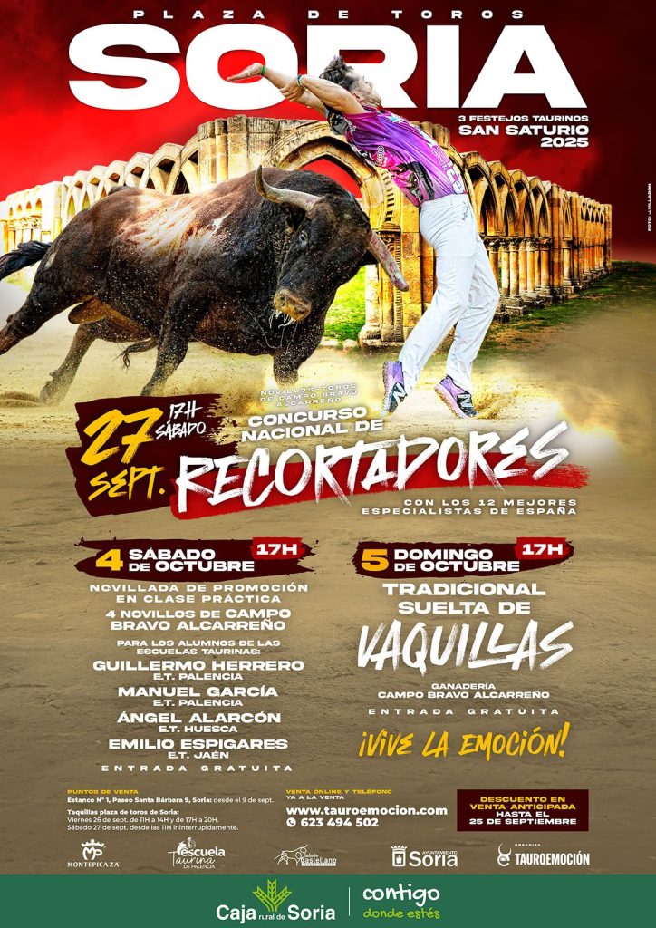 Las entradas para el festejo, que cuenta con precios populares y descuento en venta anticipada hasta el día 25 de septiembre, siguen a la venta en el estanco número 1 de Soria (Paseo Santa Bárbara 9) o en la página web oficial de la empresa www.tauroemocion.es