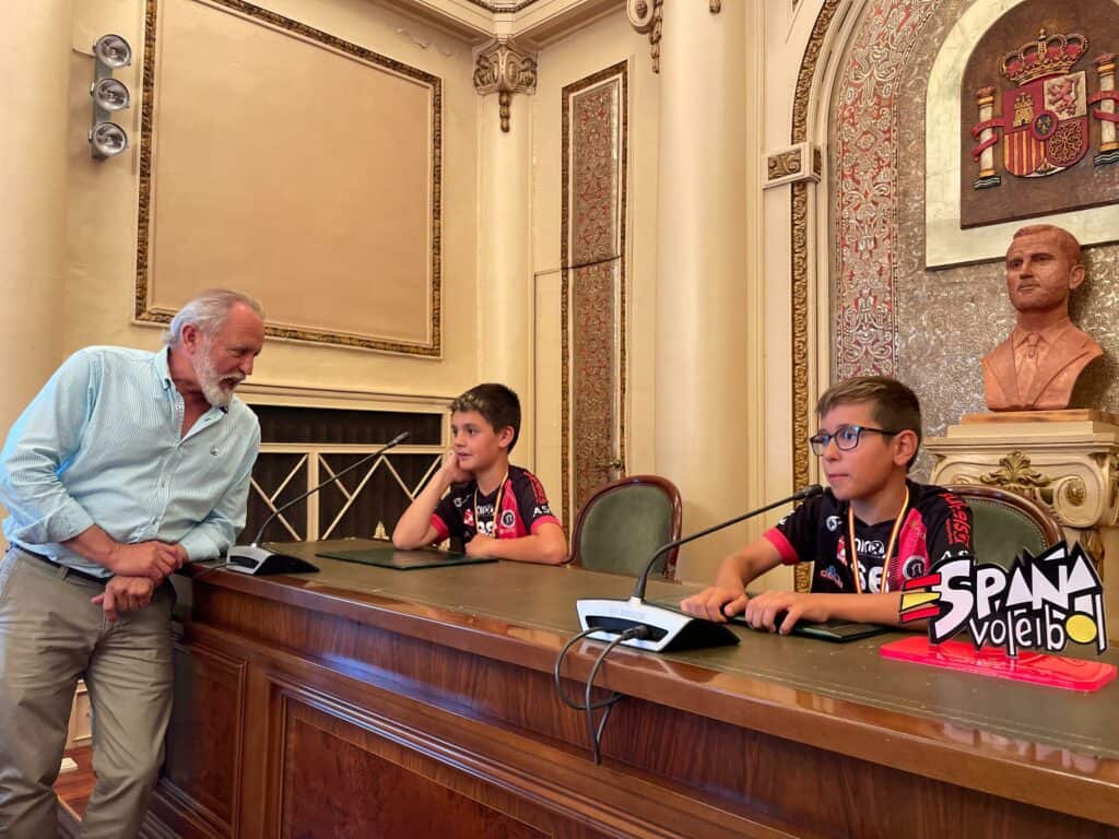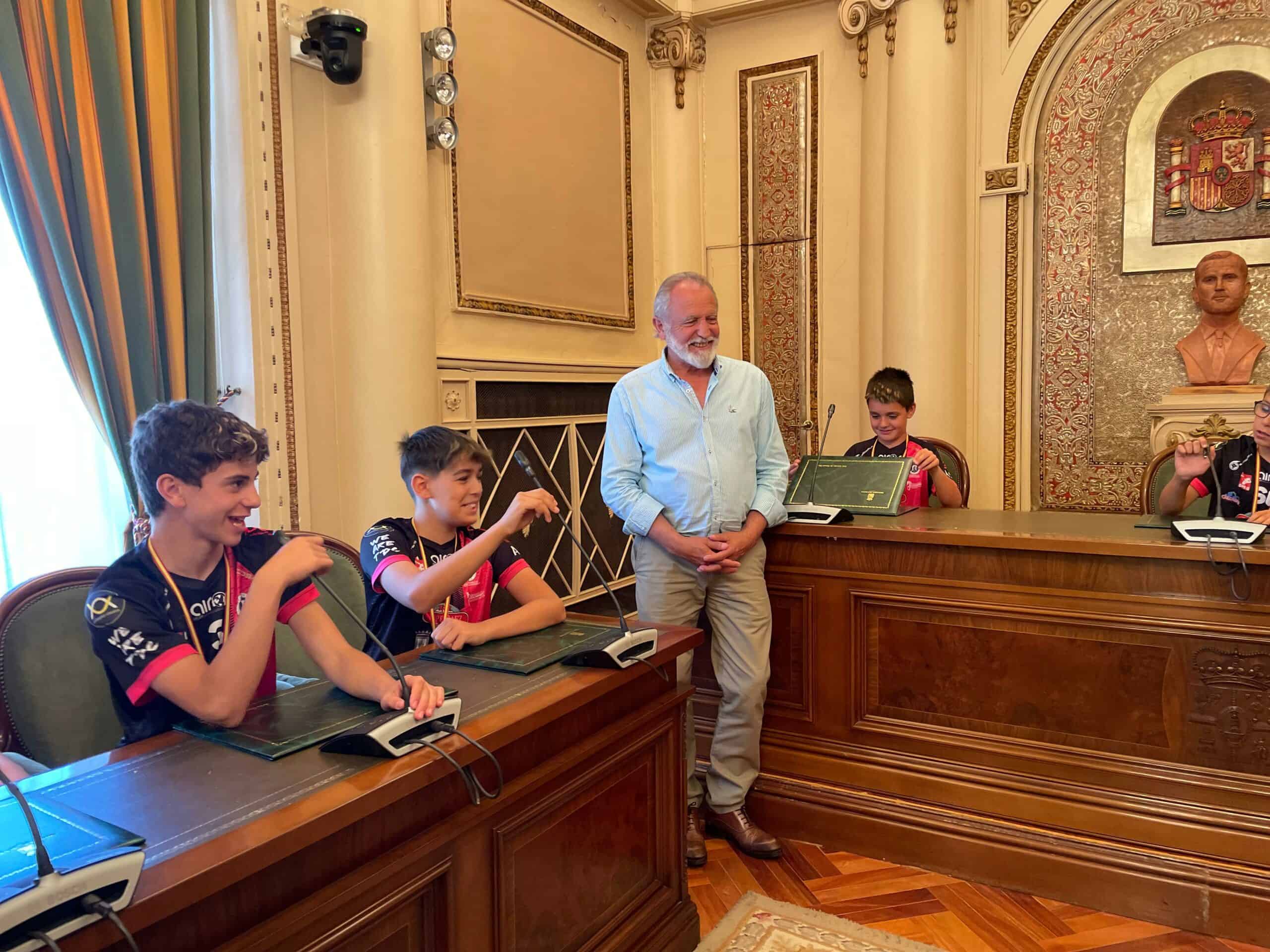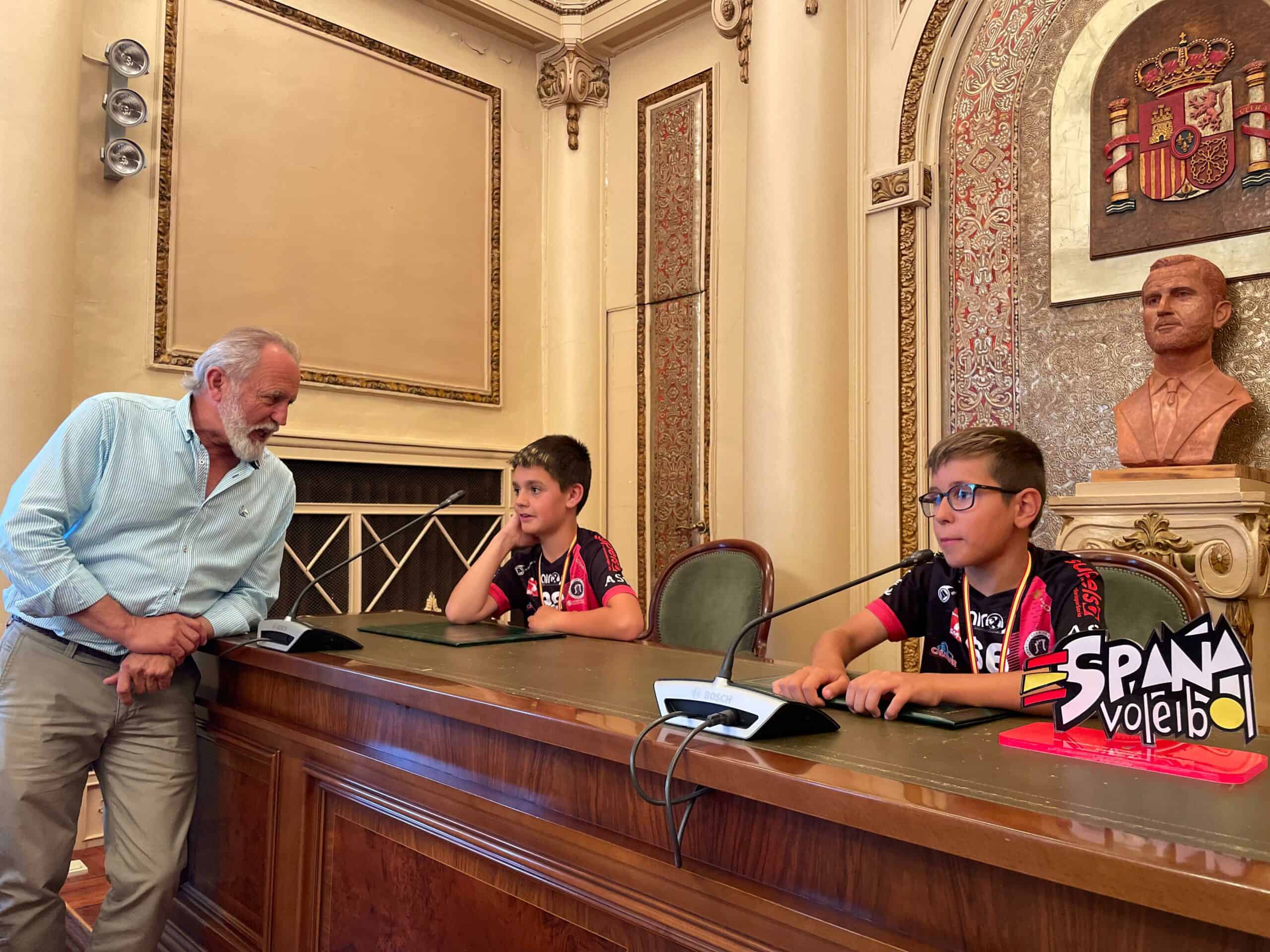 Jugadores y entrenadores del Canal 9 Sporting Santo Domingo han tenido una agenda institucional intensa esta mañana. Los campeones de España de categoría alevín de voleibol han sido recibidos a mediodía por el alcalde de Soria. Carlos Martínez les ha felicitado por el éxito cosechado. Junto con el edil de Deportes, Manuel Salvador, han reconocido la magnífica labor lograda por este conjunto de jugadores y les han hecho entrega de un obsequio.