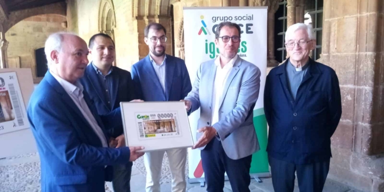 El Abad de la Concatedral, Alejandro Casado, y el delegado de ONCE en Castilla y León, Ismael Pérez, han presentado este cupón en el Claustro de la Concatedral de San Pedro de Soria, en un acto en el que han esta acompañados por el Párroco de la Concatedral de San Pedro,  David Gonzalo, el director de ONCE en Soria, Luis Alberto Pareja, y el vicepresidente del Consejo Territorial, Rodrigo Gonzalo.