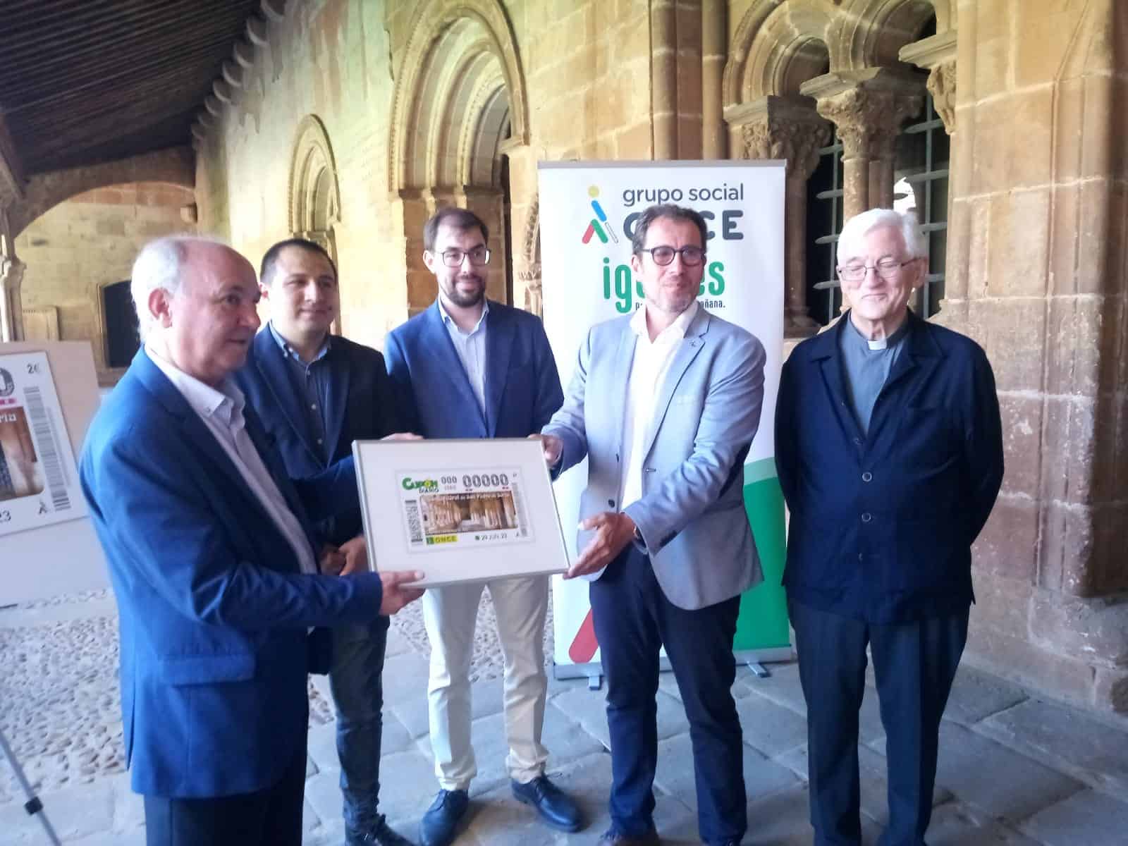 El Abad de la Concatedral, Alejandro Casado, y el delegado de ONCE en Castilla y León, Ismael Pérez, han presentado este cupón en el Claustro de la Concatedral de San Pedro de Soria, en un acto en el que han esta acompañados por el Párroco de la Concatedral de San Pedro,  David Gonzalo, el director de ONCE en Soria, Luis Alberto Pareja, y el vicepresidente del Consejo Territorial, Rodrigo Gonzalo.