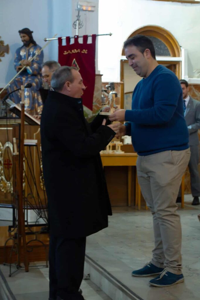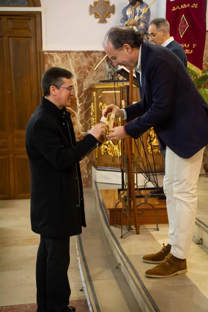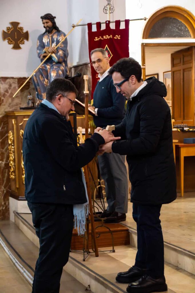 Además, se presentó una nueva cruz que acompañará al Ecce Homo. Se trata de una cruz ‘Tau’, claro origen franciscano, y que se denominará ‘La Cruz de los Ausentes’ la cual pretende recordar a todos los hermanos cofrades fallecidos. Por último destacar los nuevos báculos que los hermanos portarán en filas. Unos básculos más ligeros y cómodos que destacan en su parte alta por estar rematados con una cruz Tau.