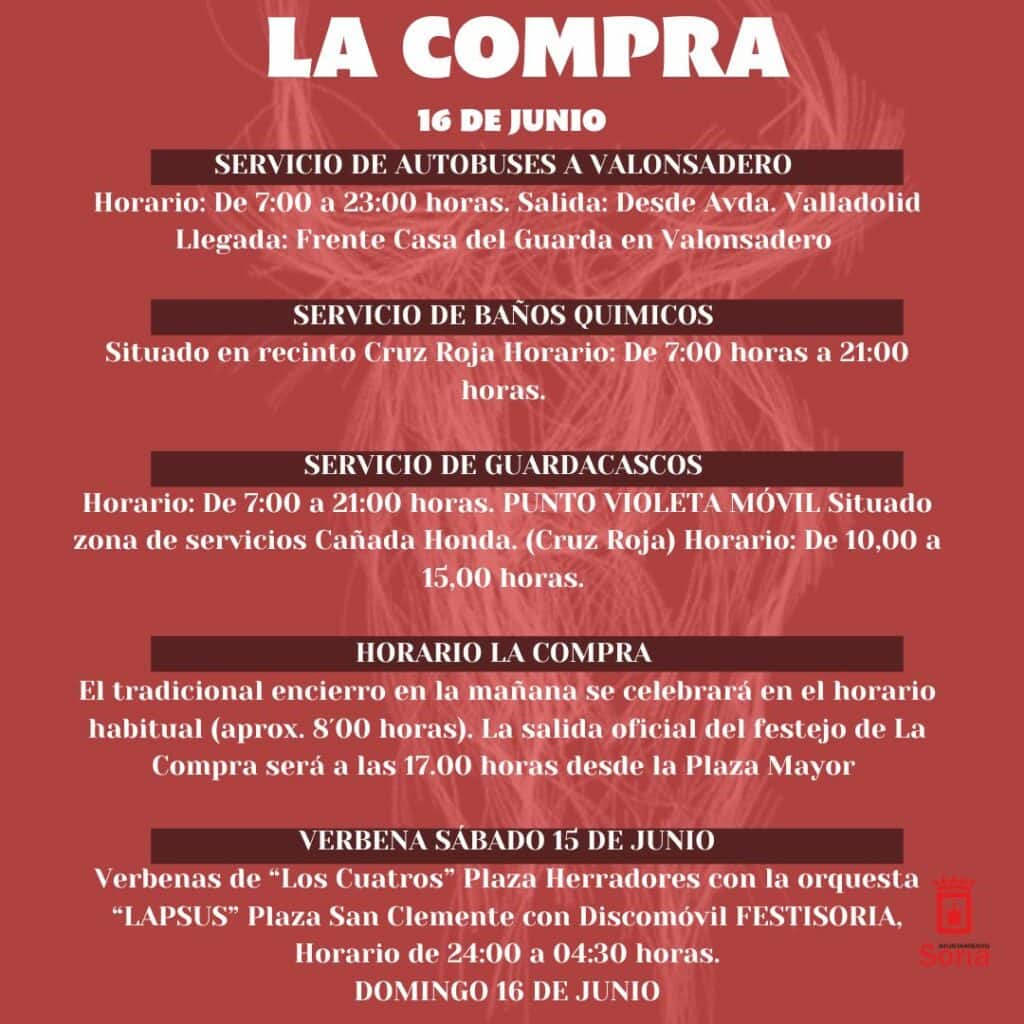 El Ayuntamiento de Soria ha anunciado los diferentes servicios que pondrá a la disposición de los vecinos y vecinas de cara a la celebración de La Compra de este domingo. Se contará con servicio de autobús desde las 7:00 horas para poder disfrutar del encierro de la mañana de La Comprilla que arrancará a las 8:00 horas.Al igual que en Desencajonamiento y Lavalenguas, se contará también con servicio de baños químicos, punto violeta y guardacascos. La salida oficial del festejo se realizará a las 17:00 horas en la Plaza Mayor. Además se contará con verbena de Los Cuatros en Herradores y con discomóvil en el Tubo.