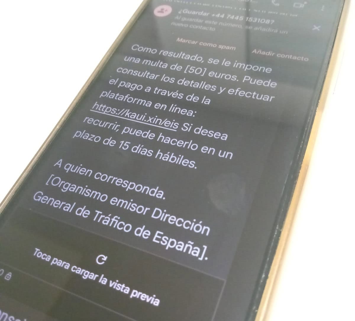 En la jornada de hoy hemos recibido una alerta de un vecino en el que nos indican que se está enviando un SMS fraudulento. En este mensaje se suplanta la identidad de la Dirección General de Tráfico, «informando» al usuario que lo ha recibido de que tiene una multa. Multa que se le interpone supuestamente por exceso de velocidad cuando «no superaba el límite de velocidad en un 20% en la zona de velocidad permitida».