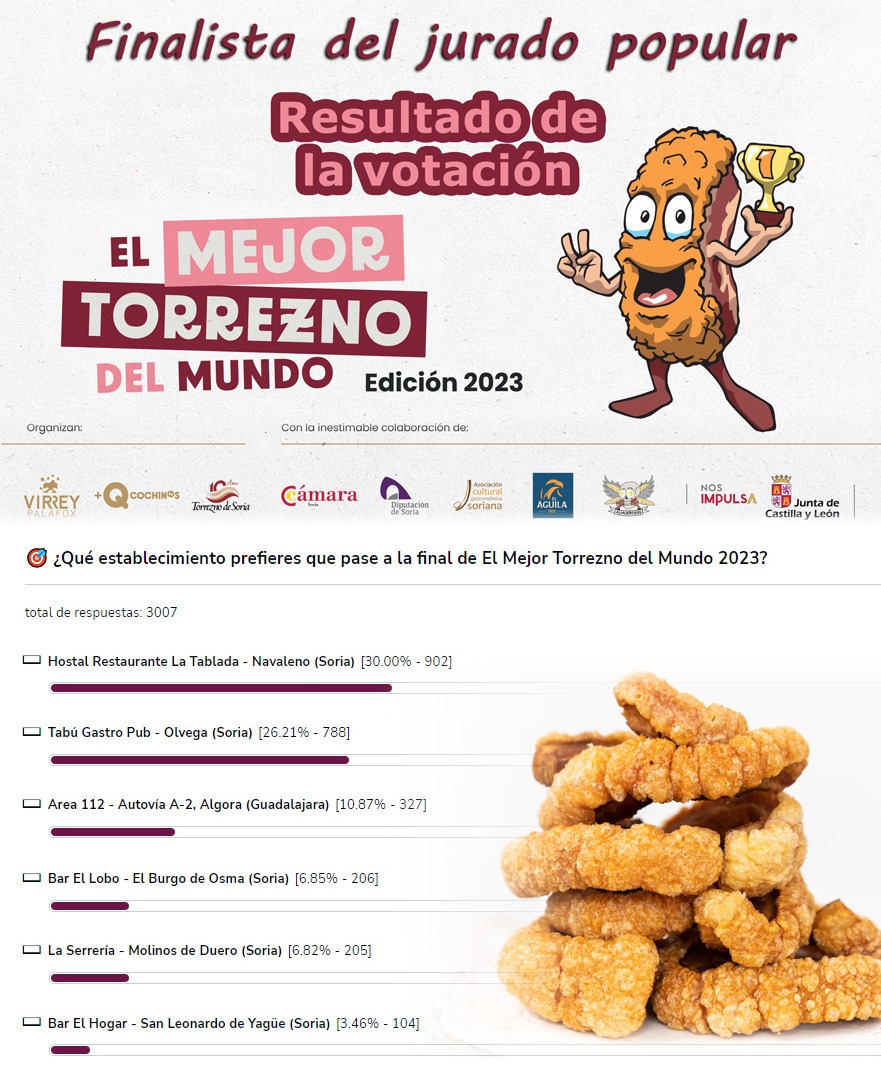 La final del Mejor Torrezno del Mundo, que se celebrará el próximo 12 de marzo en el Virrey Palafox de El Burgo de Osma, tendrá un nuevo finalista. Se trata del Hostal Restaurante La Tablada, de Navaleno, elegido a través del sistema de votación popular, novedad de la edición del concurso en 2023. El conocido establecimiento pinariego ha recibido 902 de los 3007 votos emitidos, un 30%. En segundo lugar ha quedado el Tabú Gastro Pub, de Ólvega, con 788 votos, seguido del Área 112, de Algora (Guadalajara), con 327 votos.
