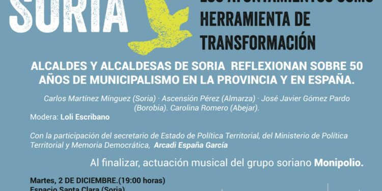 La Subdelegación del Gobierno en Soria celebra mañana martes, 2 de diciembre, una nueva actividad del programa “50 Años de España en Libertad” con la mesa redonda “Los ayuntamientos como herramienta de transformación”, que tendrá lugar en el Espacio Santa Clara a las 19:00 horas. El encuentro busca reflexionar sobre los últimos cincuenta años de municipalismo en España, analizar los logros alcanzados y los retos pendientes, y reconocer el papel de los ayuntamientos en la construcción democrática y el progreso de los municipios.