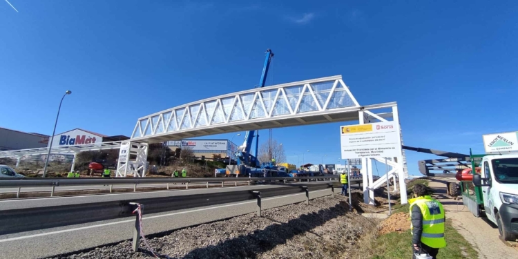 La instalación de la estructura superior de la pasarela de Las Casas se ha hecho muy rápida, ya que en sólo 10 minutos estaba instalada. Este proyecto de 550.000 euros del Ayuntamiento de Soria, subvencionado con 200.000 euros del Gobierno de España, permitirá el acceso a vecinas y vecinos del barrio de Las Casas con la ciudad.